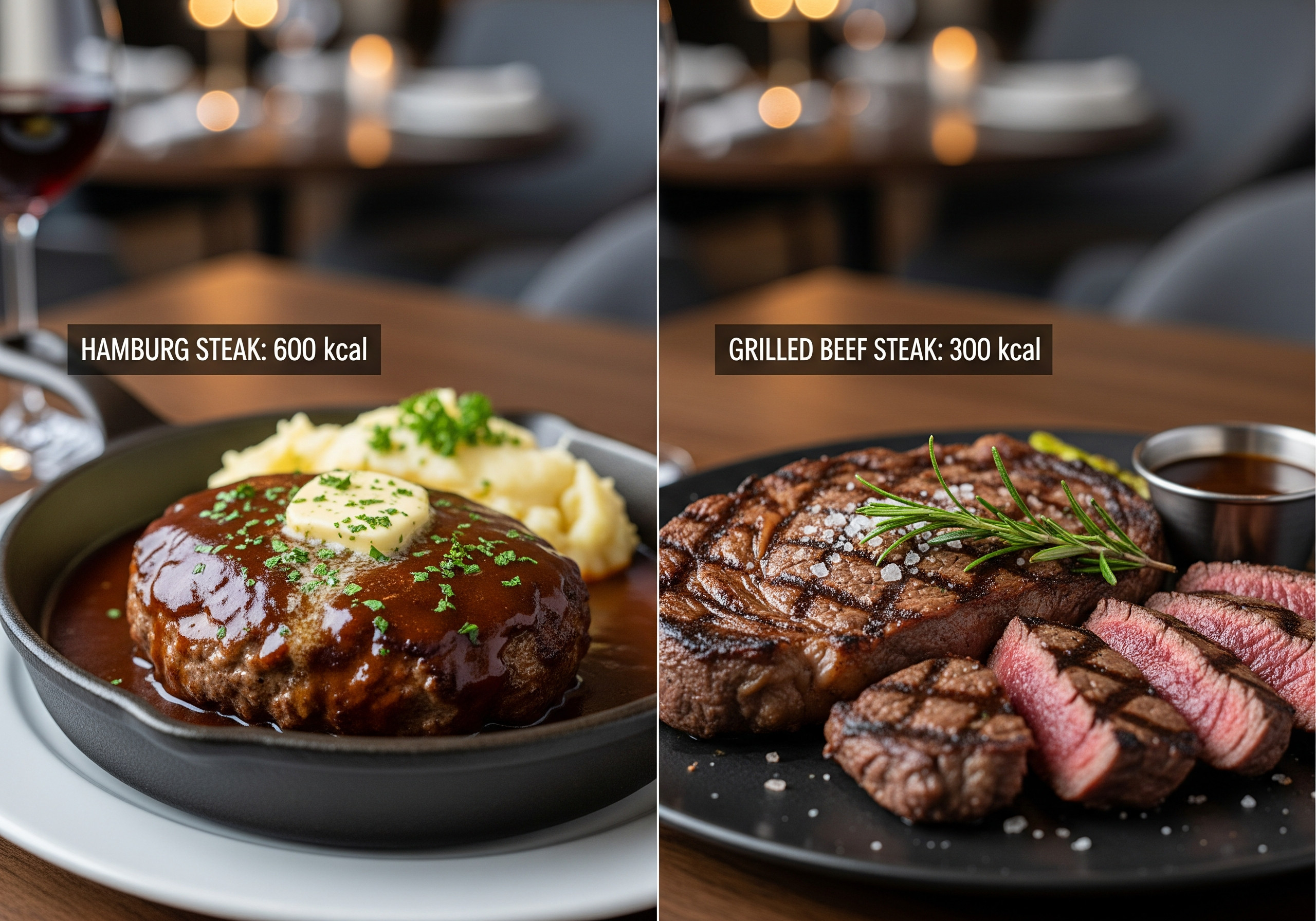 一見似ているようで、実はカロリーに違いがあるハンバーグとステーキ。